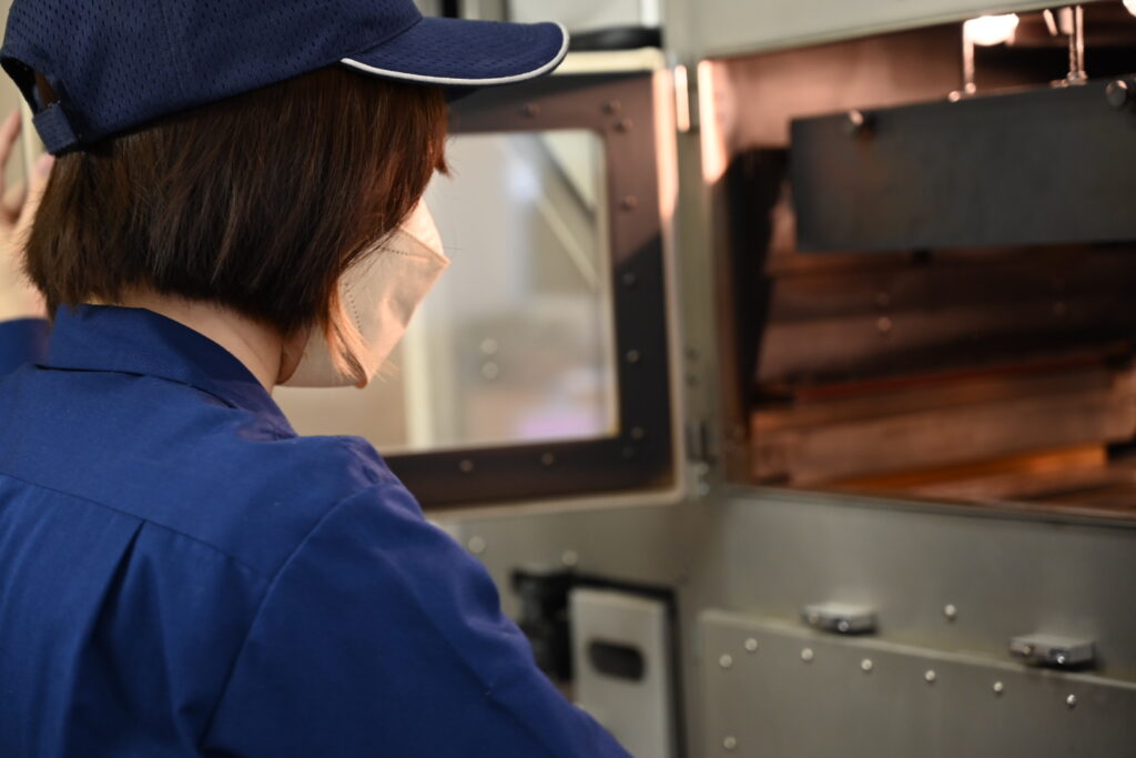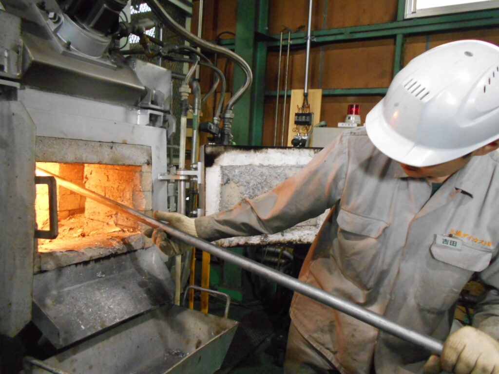 鋳造機周辺と溶解炉の清掃をします。アルミを溶かした後に炉の中を清掃します。とても熱いので細心の注意を払い行っています。